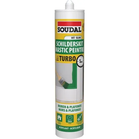 Ce mastic de peintre Soudal Turbo blanc est un mastic acrylique spécialement développé qui présente l’avantage de pouvoir être repeint très rapidement. Le mastic est déjà sec au bout de 10 minutes et peut être peint parfaitement. Le kit ne peut être utilisé que pour des applications intérieures. L’emballage contient 290 ml.