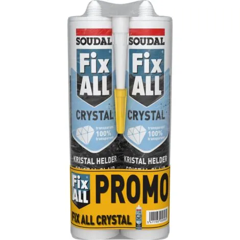 Avec le mastic Fix All Crystal de Soudal, vous obtiendrez un collage invisible. Le mastic colle transparent convient pour coller ou jointoyer tous les matériaux, sur différents supports et dans toutes les conditions. Le mastic colle résiste parfaitement à l’humidité, ce qui permet de l’utiliser aussi dans la salle de bains.