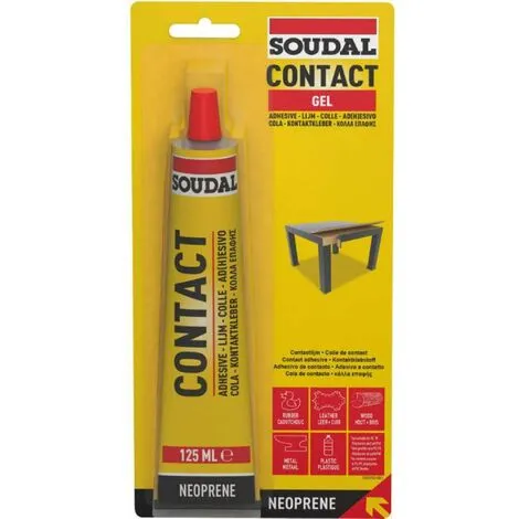 Description détaillée du produit: Produit: Colle néoprène gel Conditionnement: tube 125 ml Caractéristiques: Séchage rapide / Collage ultra fort / Bonne résistance à l’humidité / Excellente adhérence, y-compris sur matériaux synthétiques Teintes: jaune-translucide Marque: Soudal Dangereux. Respecter les précautions d’emploi. Applications: Collage de la plupart des matériaux, sur des support divers Durée de stockage: 12 mois dans son emballage fermé en un endroit sec et frais, à des températures de +5°C à +25°C